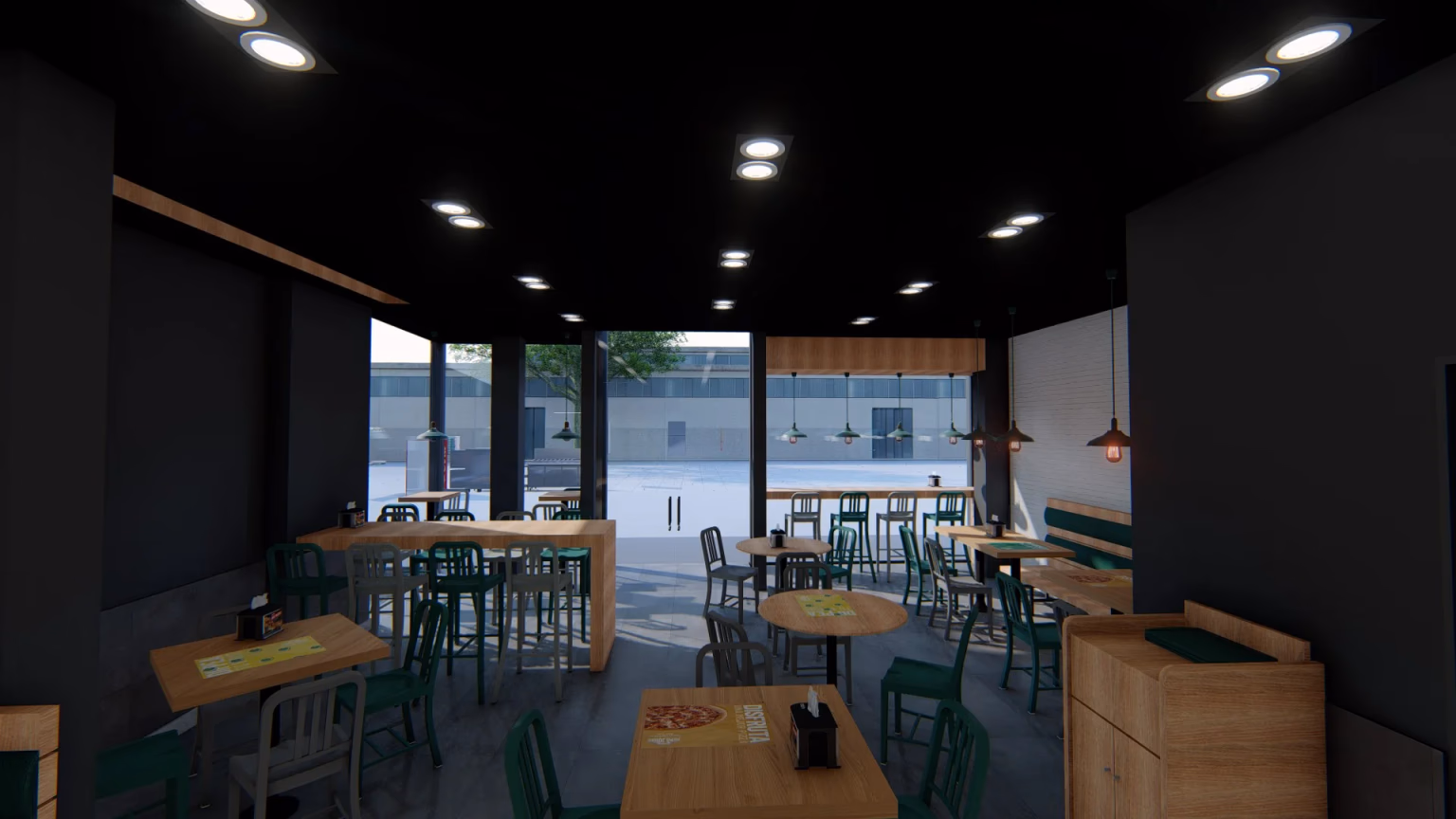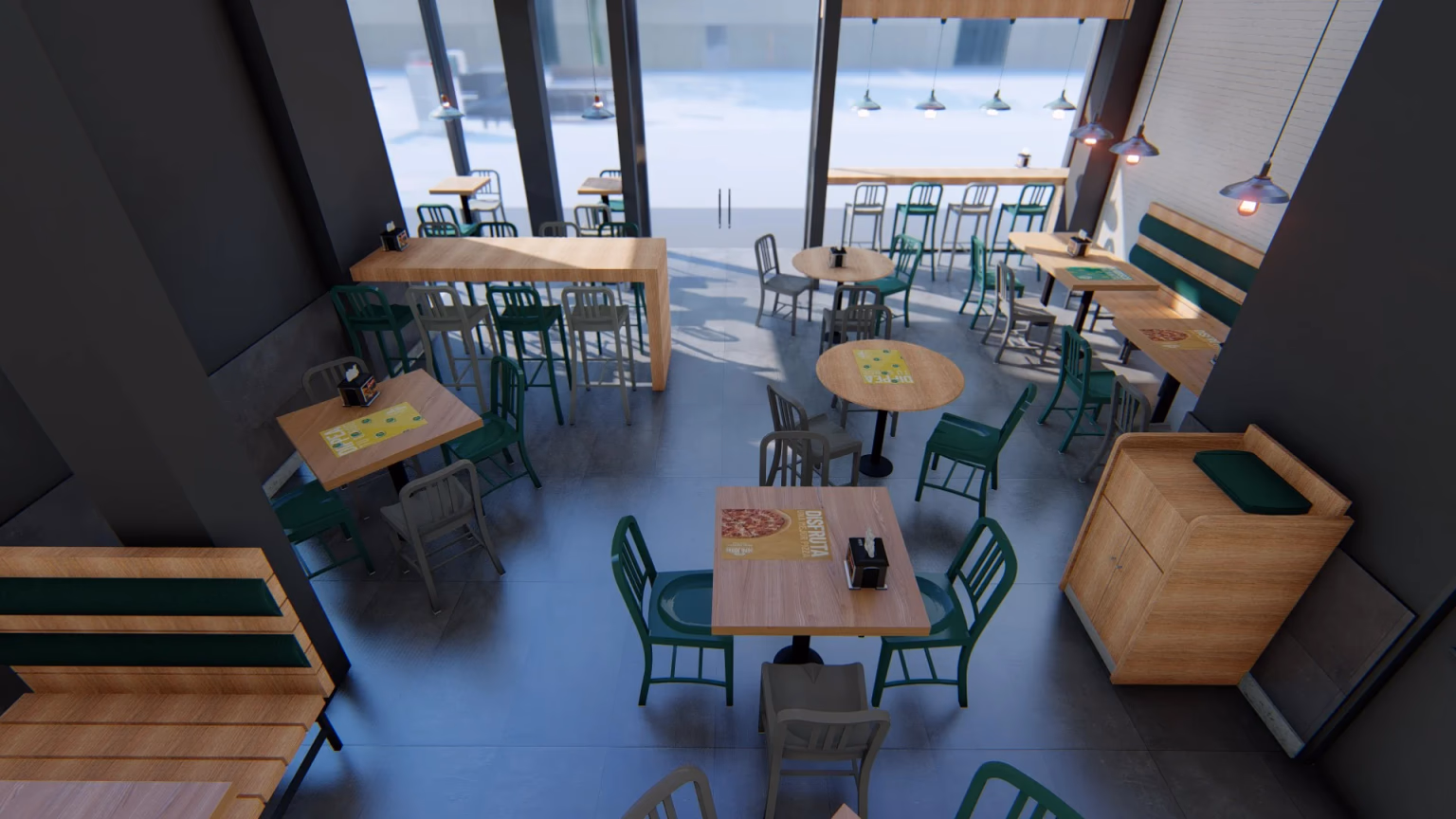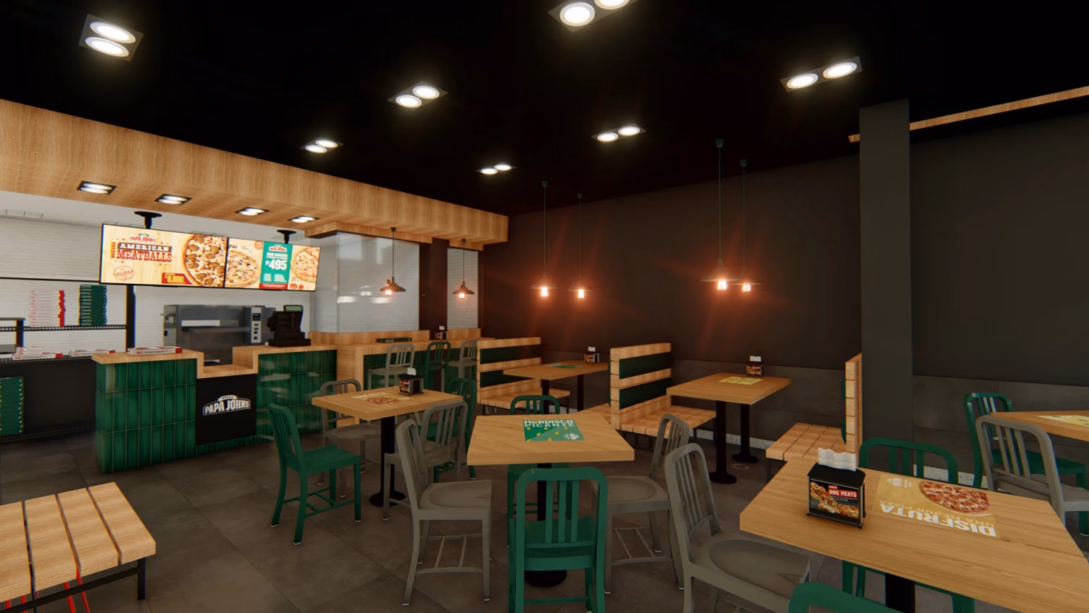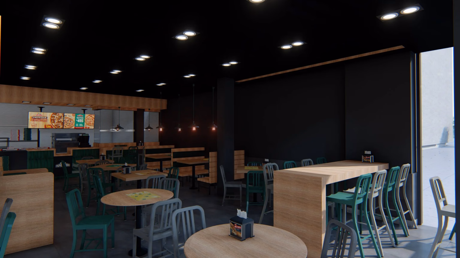 Diseño del restaurante Papa Johns en la zona de Catedral, un proyecto que equilibra la identidad de la marca con el carácter histórico y urbano del entorno, creando un espacio único y atractivo.